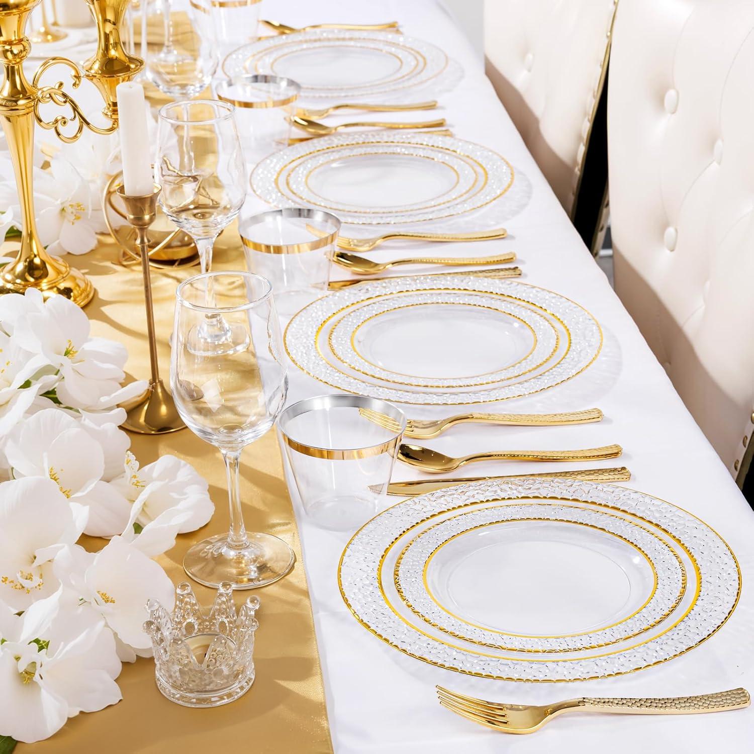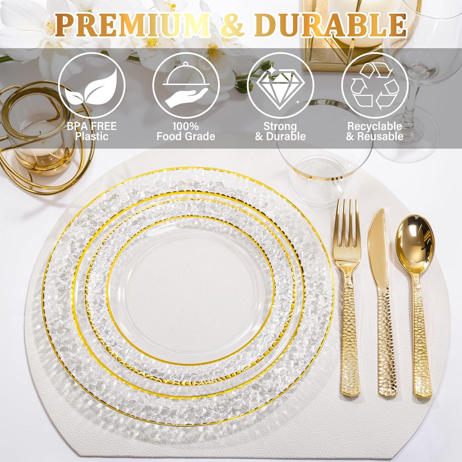 Nervure 150Pcs Clear Plastic Plates with Gold Hammered Silverware include 25Dinner Plate, 25Dessert Plate, 25Knives, 25Forks, 25Spoons and 25Cups for Wedding & Parties & Thanksgiving(Clear)