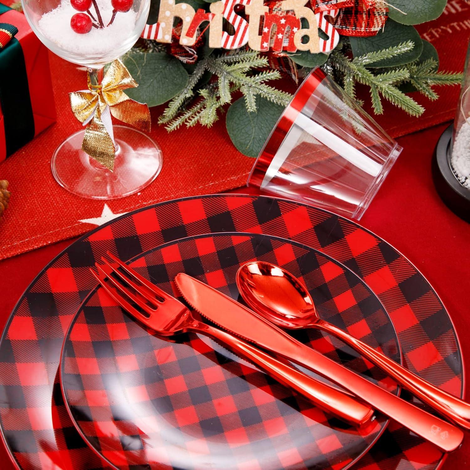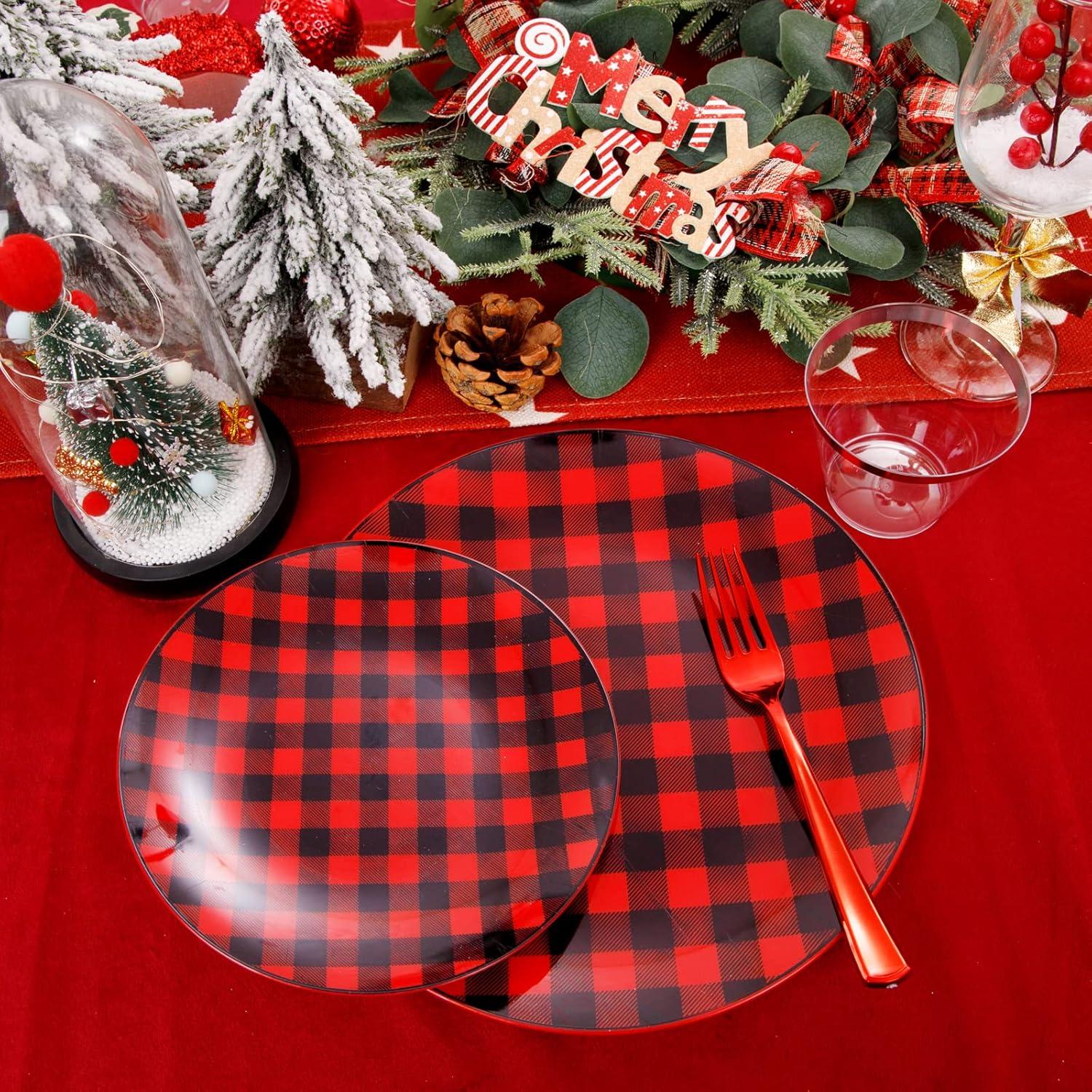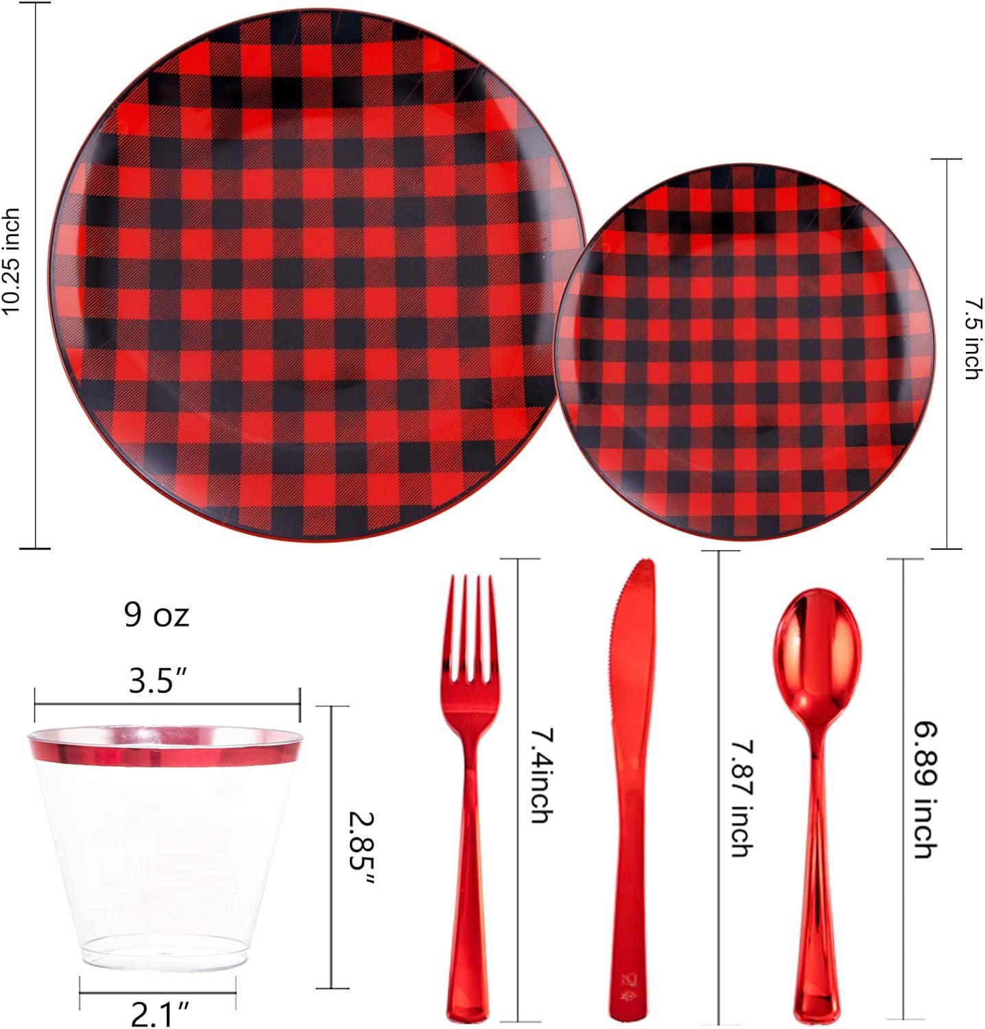LARGE PACKAGE: The plaid Christmas plates includes 25pcs dinner plates, 25pcs dessert Plates, 25pcs knives, 25pcs forks, 25pcs spoons, and 25pcs cups For 25 guests, the amount is suitable for most families to host a party. Use these buffalo plaid disposable plates to decorate your party, it will be a good choice.