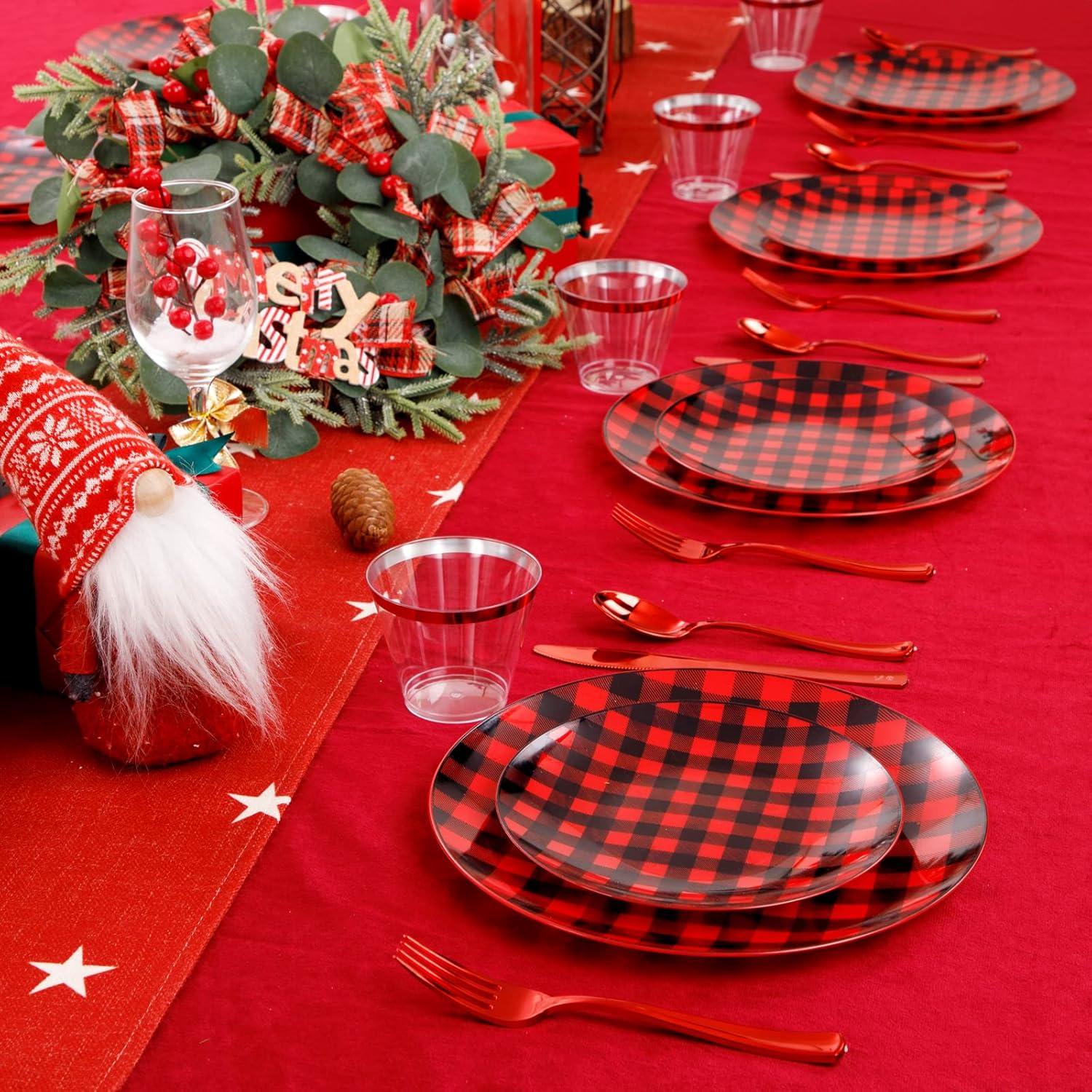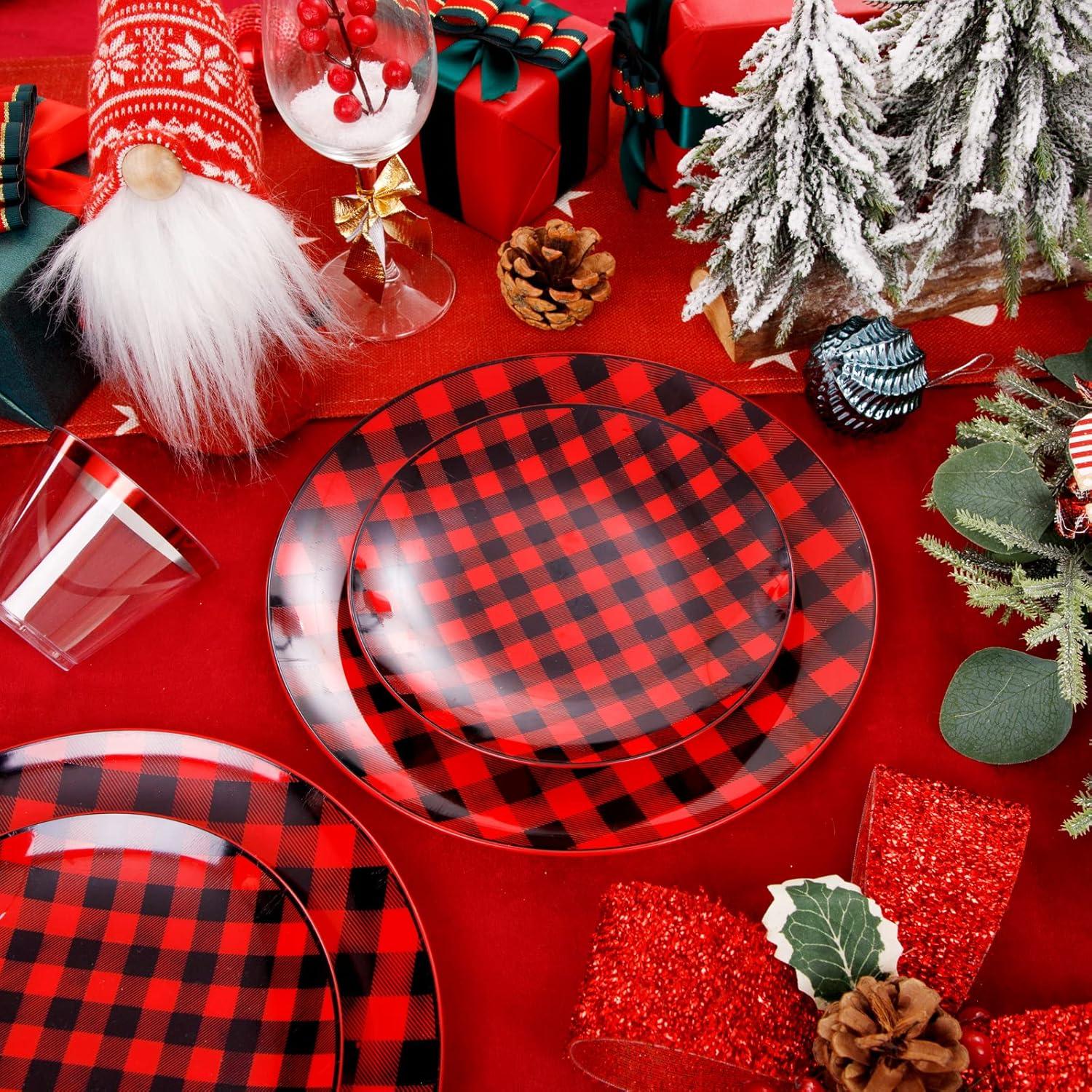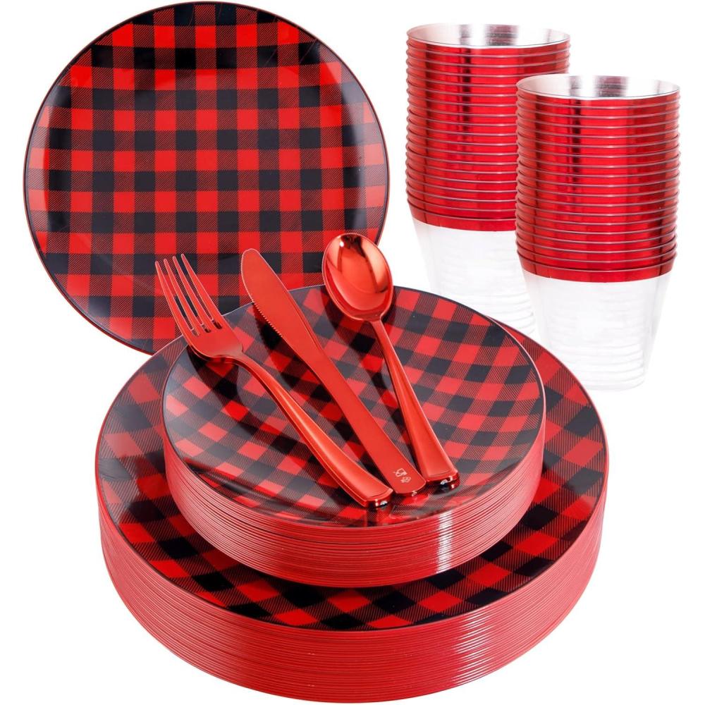 LARGE PACKAGE: The plaid Christmas plates includes 25pcs dinner plates, 25pcs dessert Plates, 25pcs knives, 25pcs forks, 25pcs spoons, and 25pcs cups For 25 guests, the amount is suitable for most families to host a party. Use these buffalo plaid disposable plates to decorate your party, it will be a good choice.