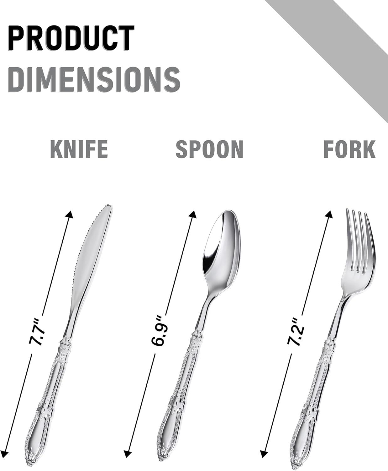 Service for 50 Guests – Luxury silver plastic utensils include 50pcs forks, 50pcs spoons, 50pcs knives perfect for wedding,party,daily use. The silver flatware can be used for gatherings involving many people