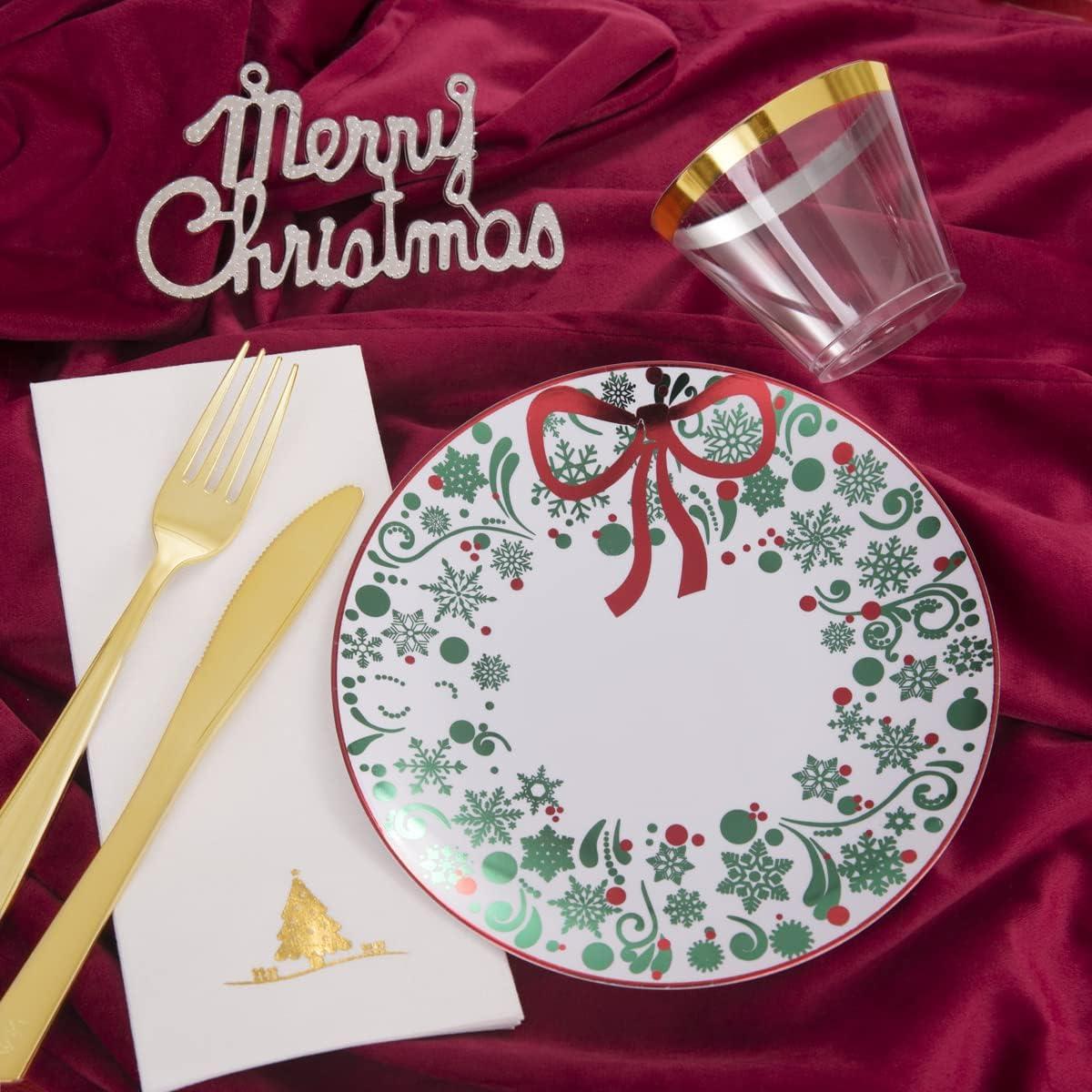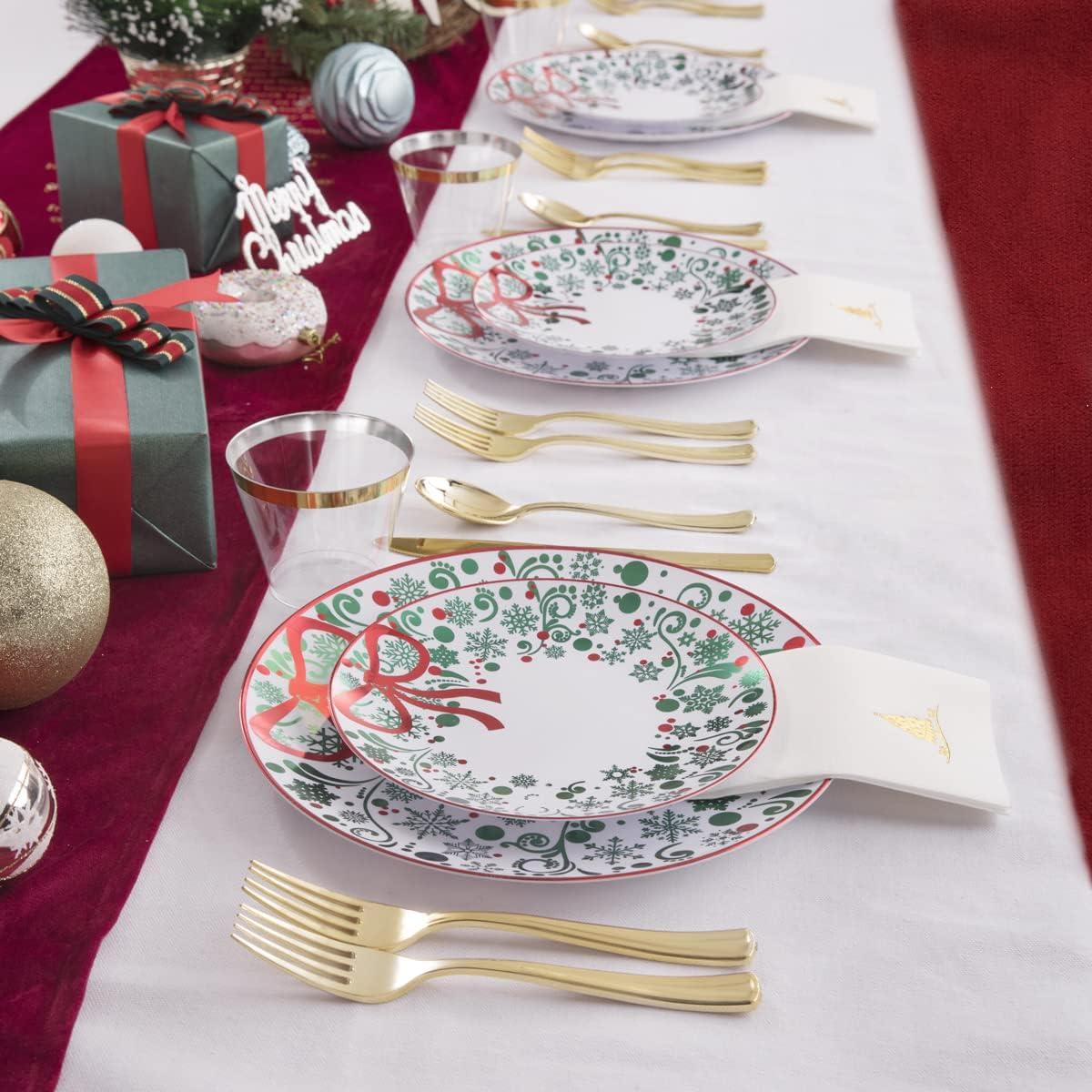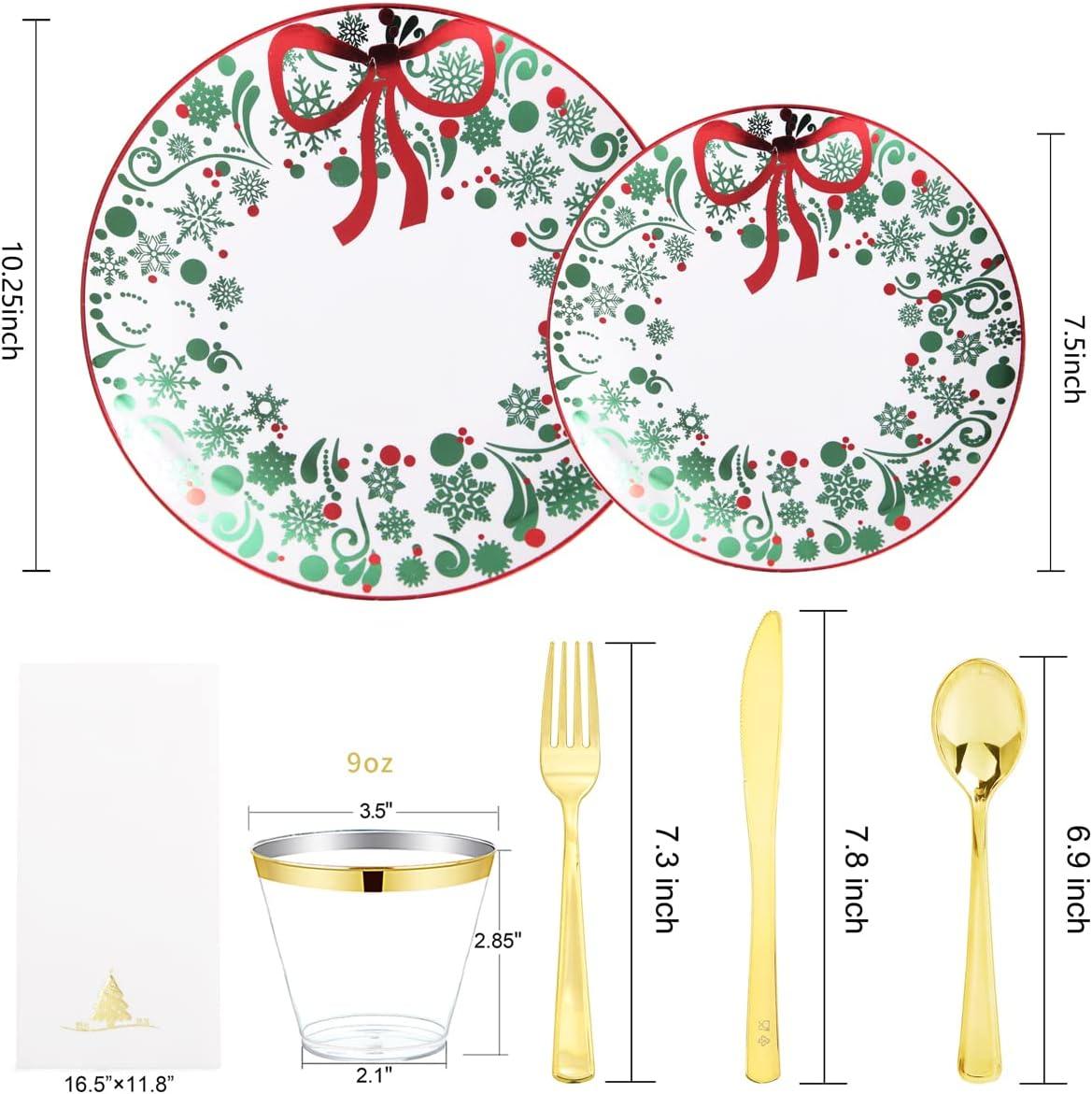 175PCS PACK DINNERWARE SET: Christmas plates and napkins sets includes 25pcs 10.25″ dinner plates, 25pcs 7.5″ salad plates, 25pcs gold rim cups, 25 forks, 25 knives, 25 spoons and 25 Christmas napkins which are to entertain 25 guests. With durable Christmas plates, it can resist breaking, bending and snapping.
