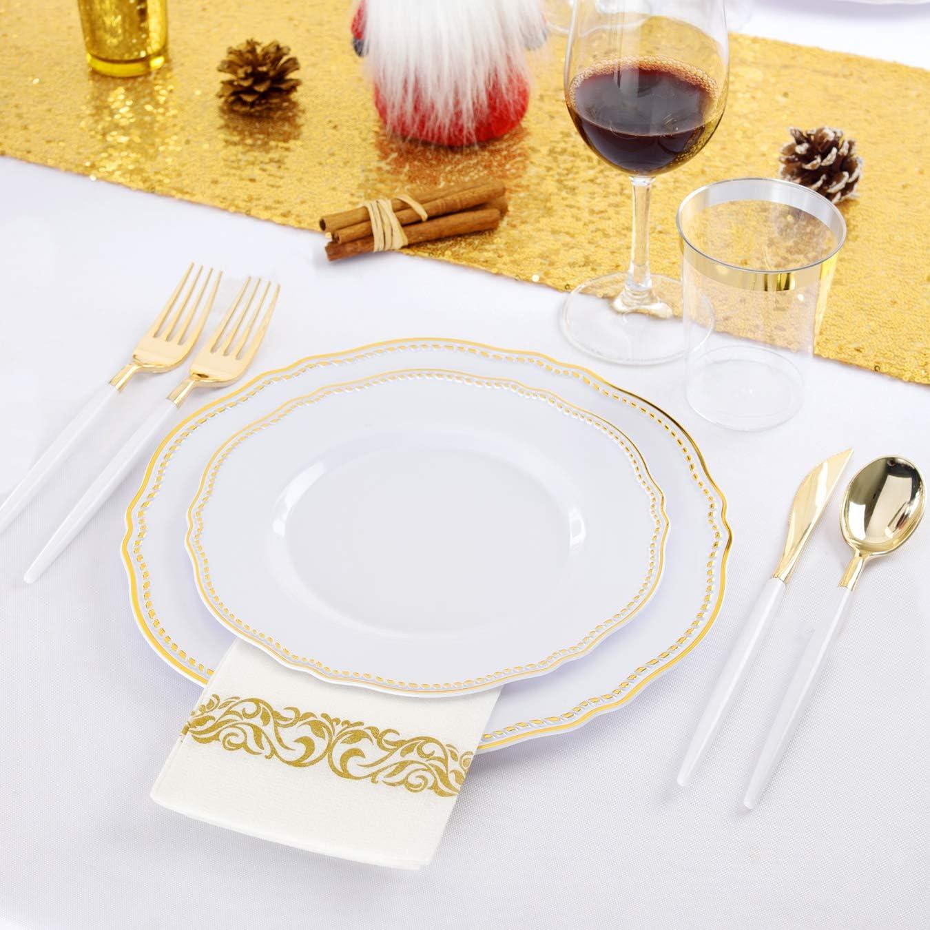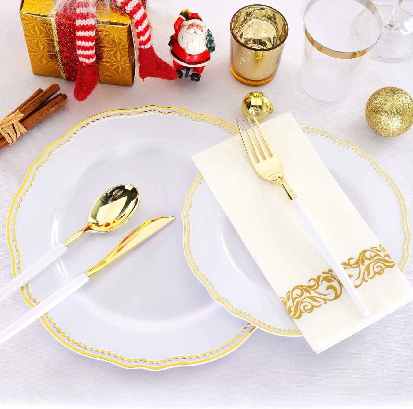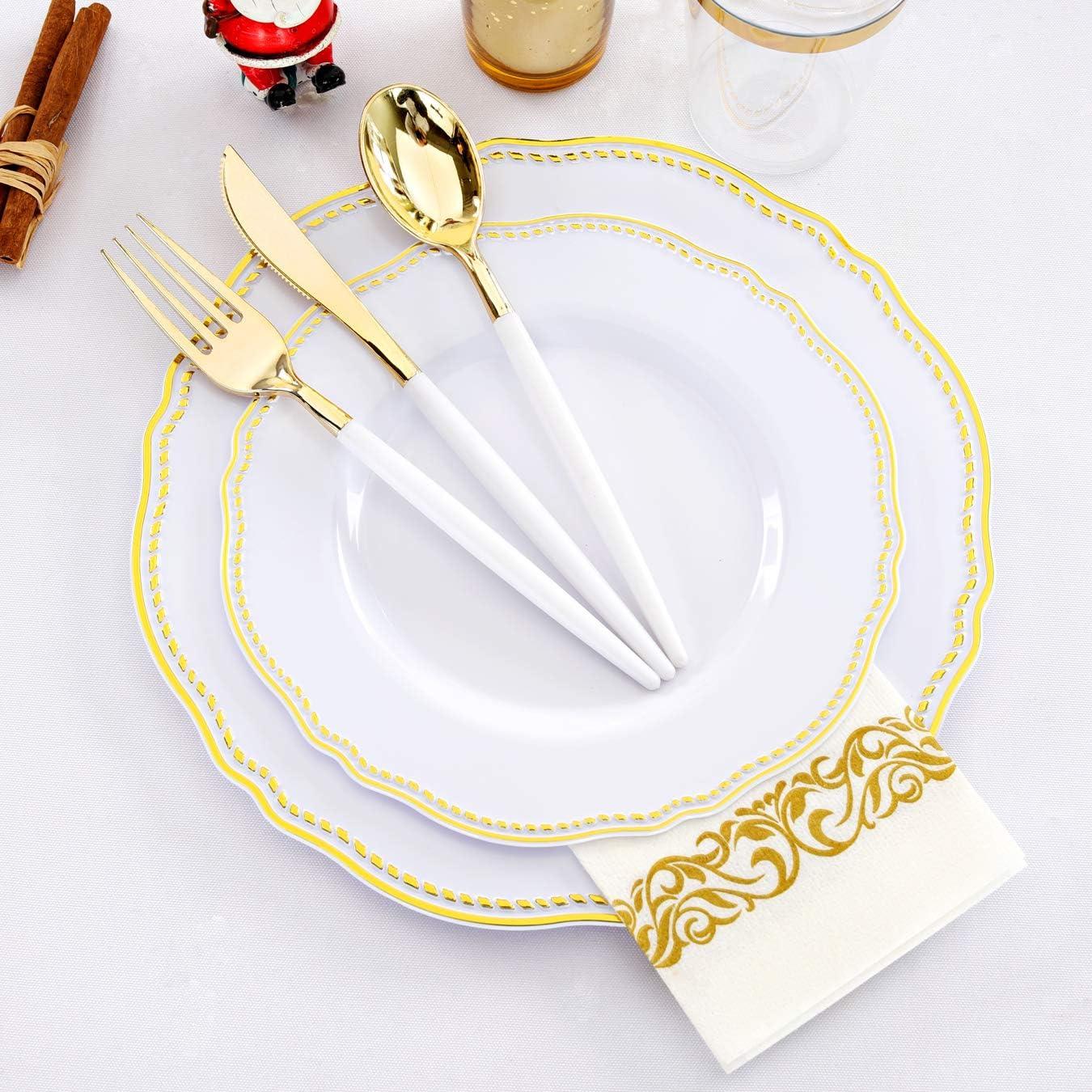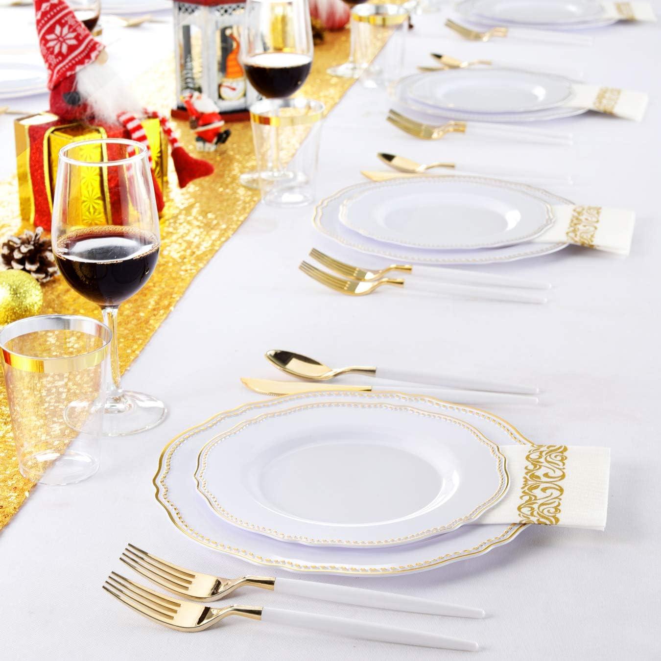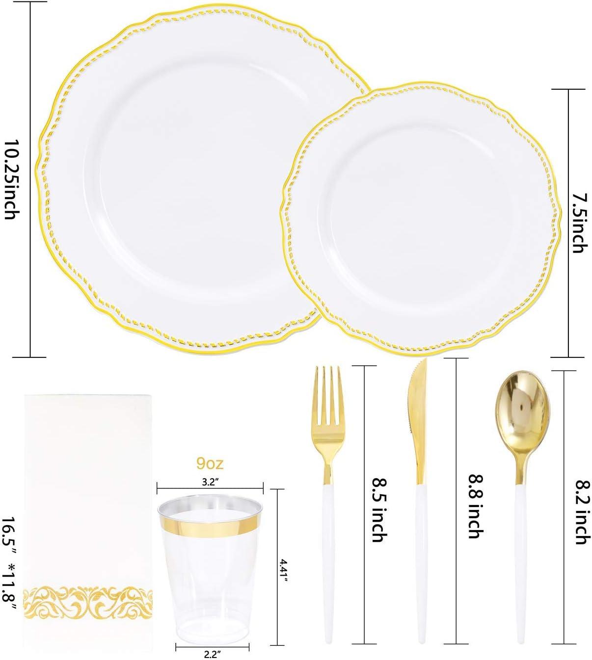 COMPLETE TABLEWARE SET:175 PCS gold plastic plates set includes 50 retro plastic plates with gold trim,75 Silverware with White handle,25cups,25 napkins,therefore,there’s no necessary to purchase any other stuff cause everything you need included.