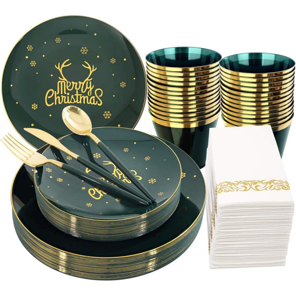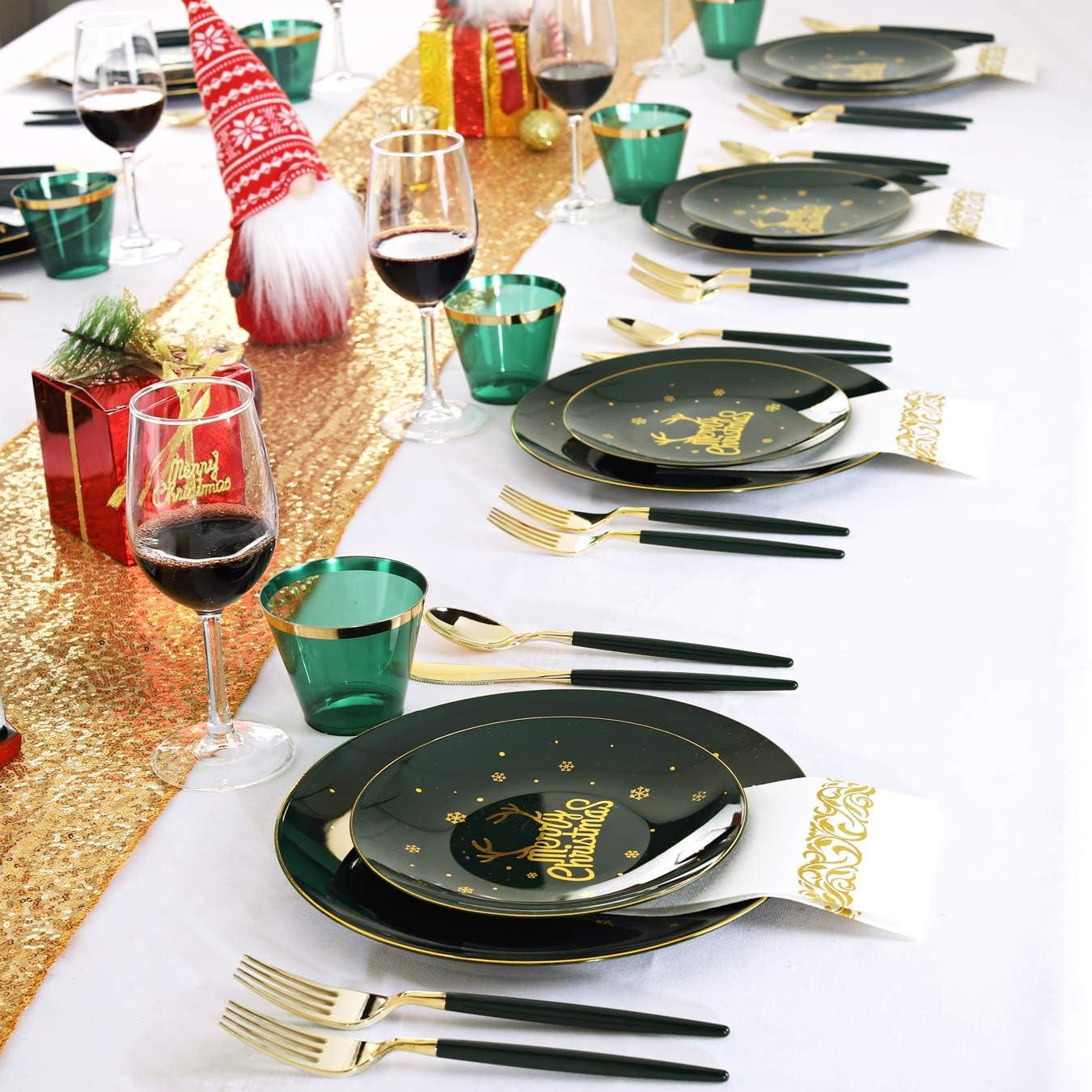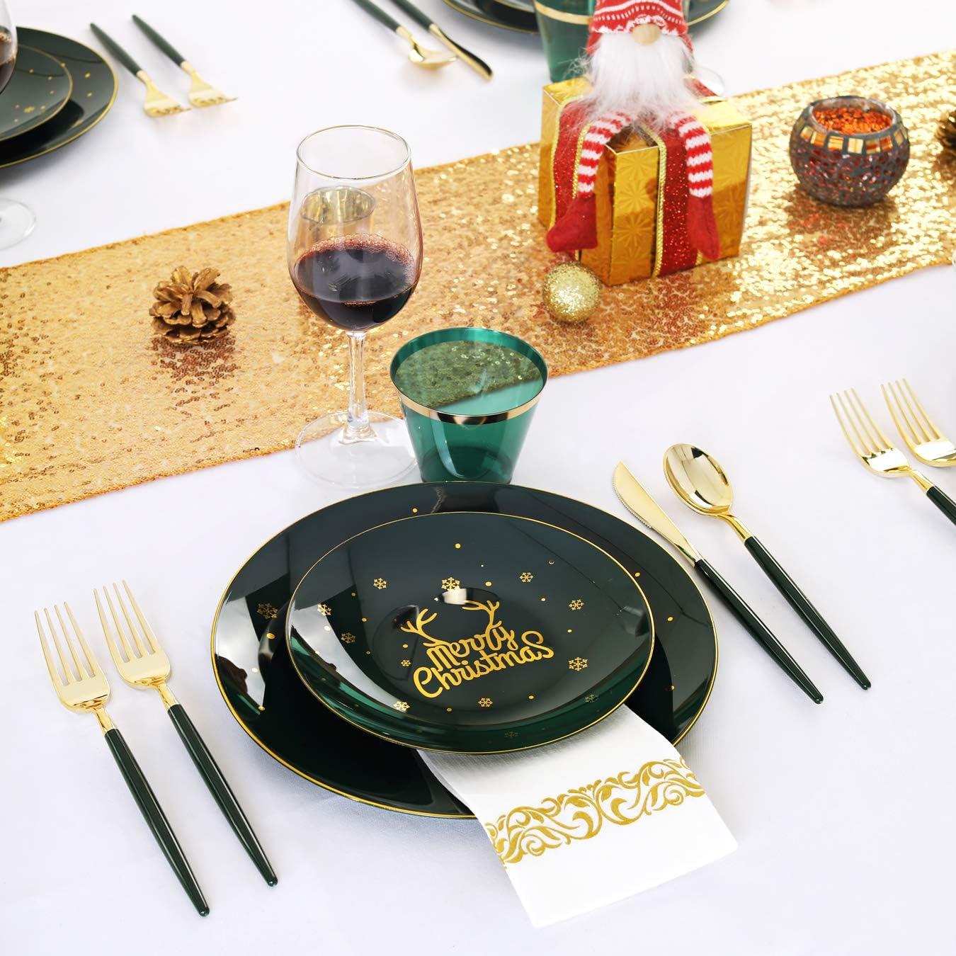 imagenervure 175pcs Green and Gold Disposable PlatesampampGold Plastic Silverware with Green Handle Include 50 Plates 25 Spoons 25 Knives 25 Forks 25 Cups 25Napkins