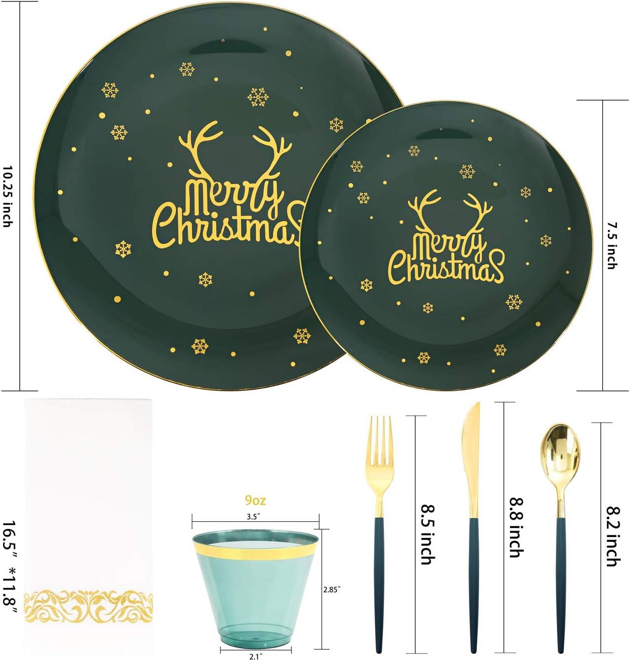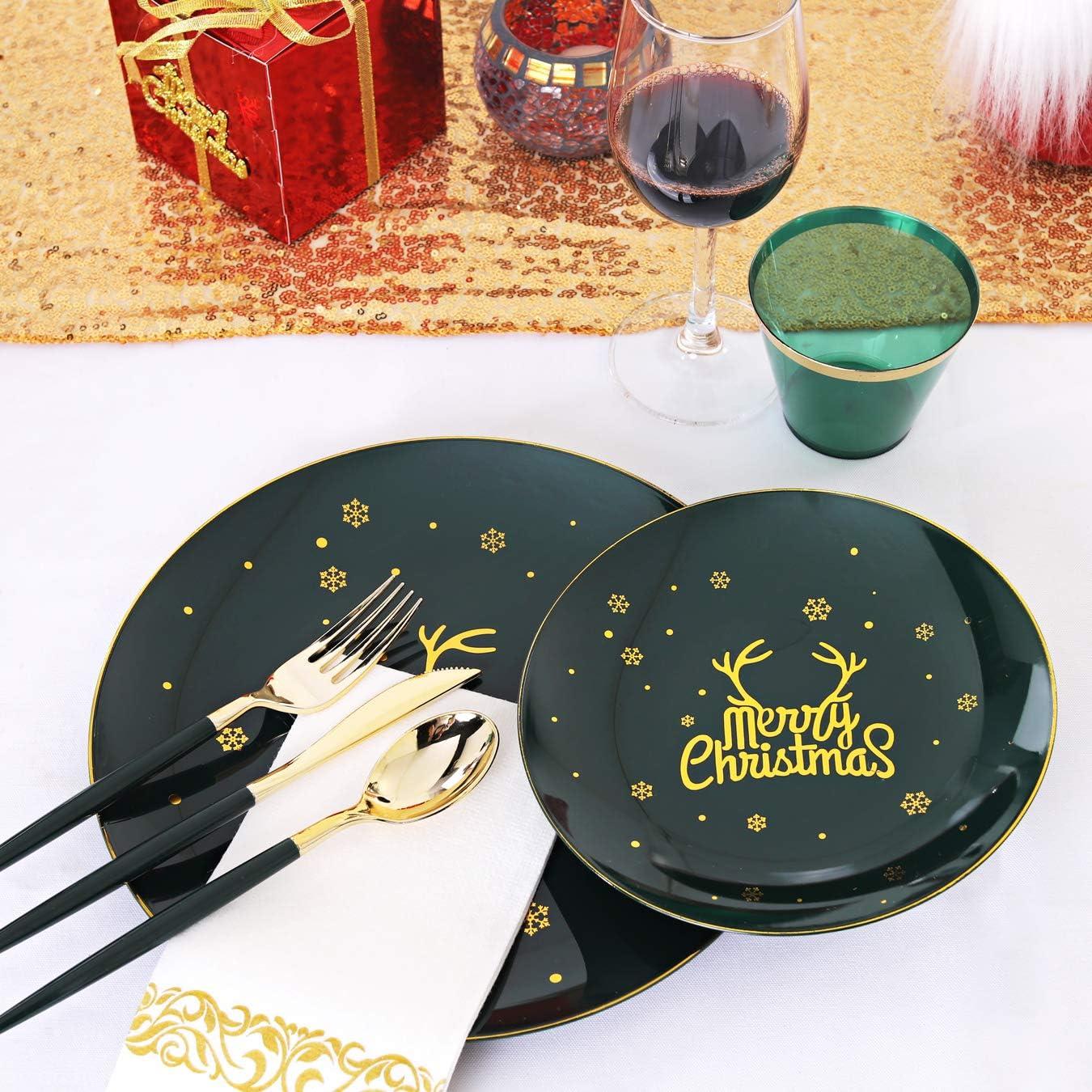nervure 175pcs Green and Gold Disposable Plates&Gold Plastic Silverware with Green Handle Include 50 Plates, 25 Spoons, 25 Knives, 25 Forks, 25 Cups, 25Napkins