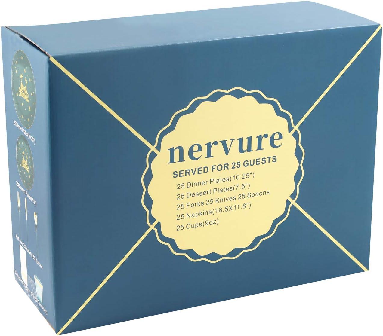 Nervure 25 Guest Party Disposable Plates Set – Gold Star Plastic Plates and Gold Rim Cup for 25 Guests (25 Dinner Plates+25 Dessert Plates+25 Gold Silverware +25 Cups) in Gold for Thanksgiving Day