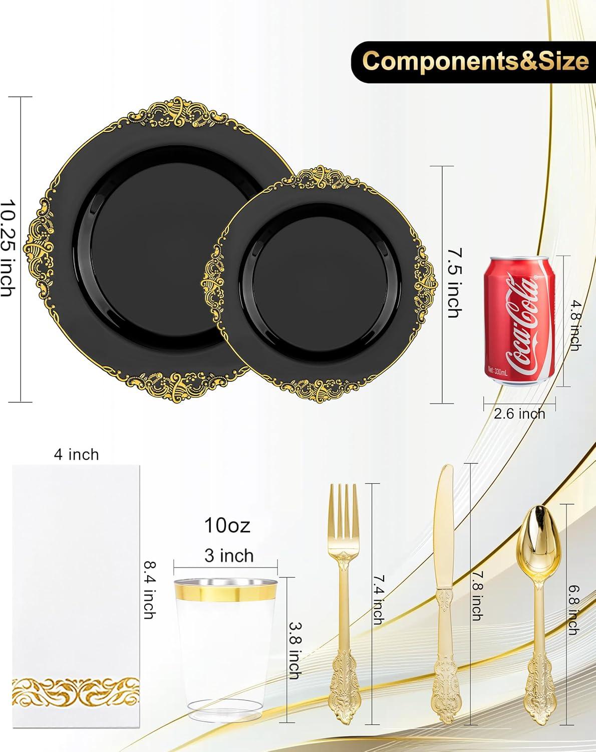 Nervure 350Pcs Blue Plastic Plates – Blue Gold Plastic Dinnerware Sets for 50 Guests – 100 Gold Disposable Plates, 50 Pre Rolled Silverware, 50 Cups Perfect for Wedding & Party & Independence(Black)