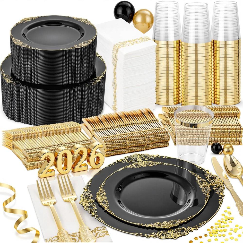 imageNervure 350Pcs Blue Plastic Plates  Blue Gold Plastic Dinnerware Sets for 50 Guests  100 Gold Disposable Plates 50 Pre Rolled Silverware 50 Cups Perfect for Wedding ampamp Party ampamp IndependenceBlack