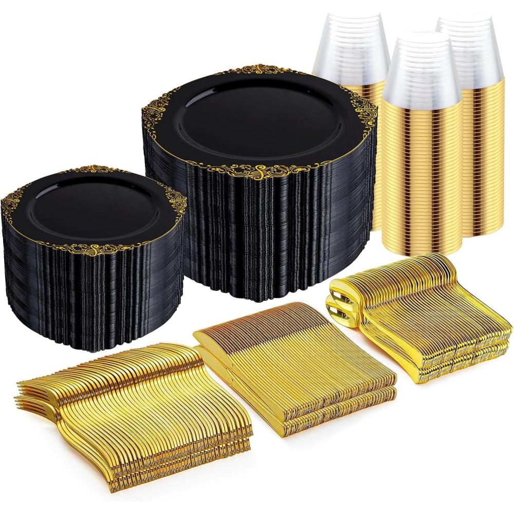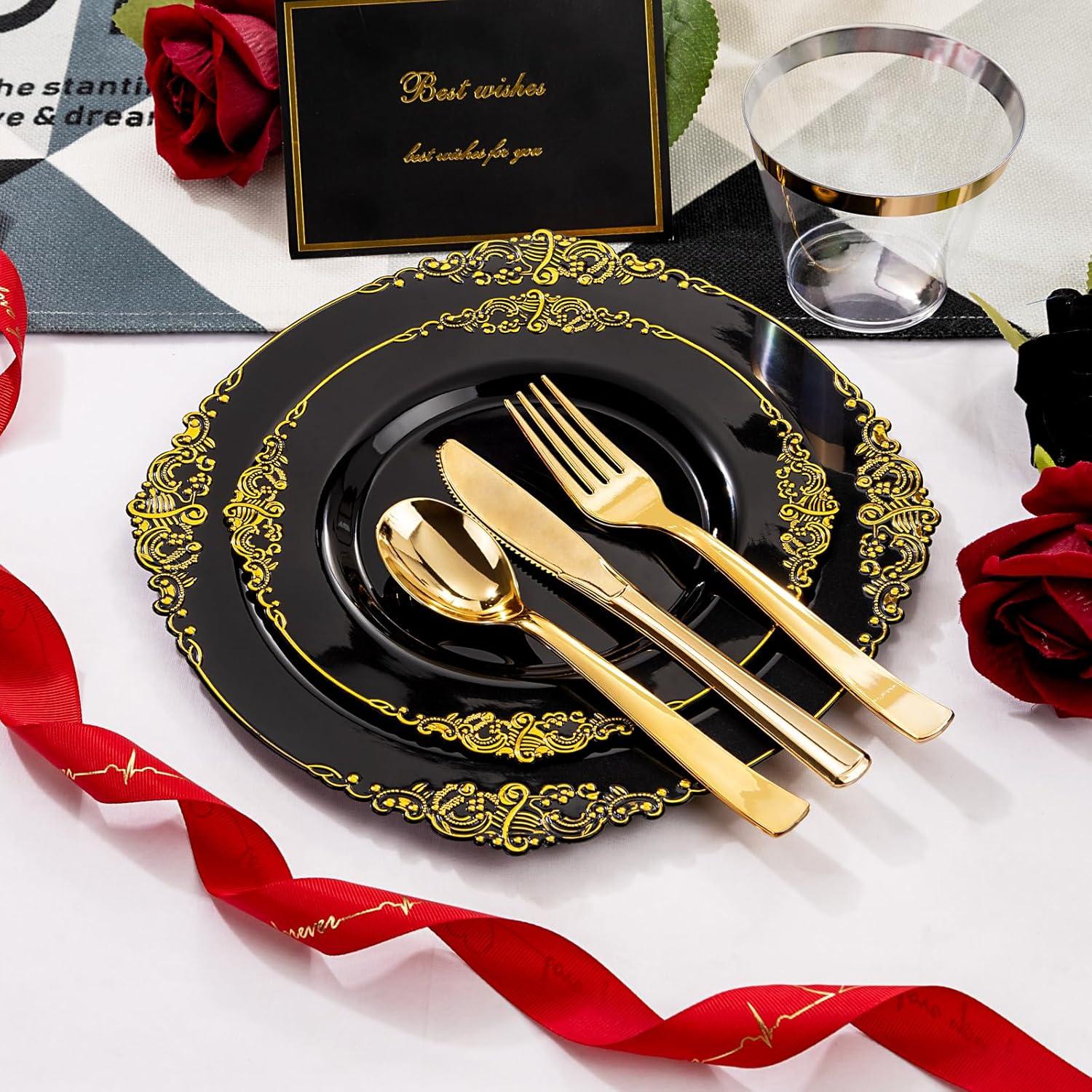 Premium Quality: Made from premium food-safe plastic, these gold plastic dinnerware sets are designed for one-time use, making them perfect for large-scale events, parties, or catered affairs where ease of cleanup is paramount. Despite being disposable, our gold plates maintain a sturdy construction that can hold a variety of meal portions without bending or breaking under weight.