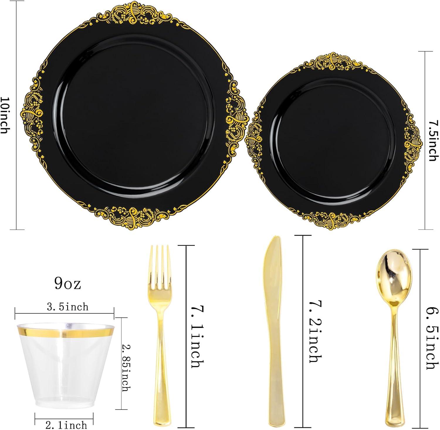 Great Value: Served for 100 guests. The white and gold plastic plates include 100 dinner plates, 100 dessert plates, 100 knives, 100 forks, 100 spoons and 100 cups. Although intended for single-use, these Baroque-styled white and gold rim plates offer a cost-effective alternative compared to traditional porcelain or ceramic ware. This gorgeous gold plates allows hosts to create an opulent atmosphere without the worry of breakage or the need for extensive post-event washing.