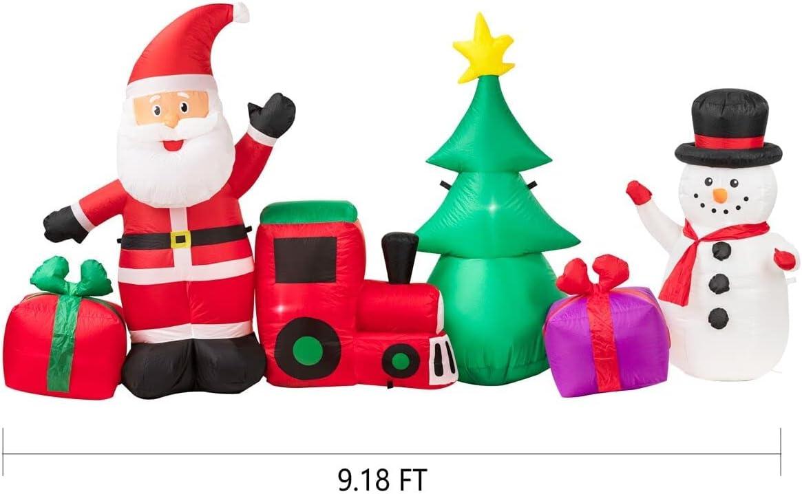 🎅Value Pack Christmas Inflatables Decorations: The Christmas inflatables adopts the appearance design of santa claus with Christmas tree, train, multicolor gift box and snowman. All of these are Christmas elements, bringing joy and warmth to the viewer. It has 1x huge Christmas inflatables outdoor decorations, 1x build-in Pump Fan, 11x Stakes, 5x 1.5m ropes, 5x iron nail, 1x power cord, 4x build-in Sandbags.
